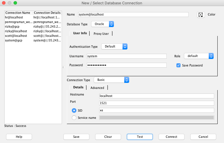 Saya sudah mengikuti tutorial menggunakan username: system pass: oracle. dan Saya juga sudah mencoba beberapa saran dari beberapa forum dengan menggunakan username: SYSTEM pass: SYSTEM dan juga username: SYS pass: SYS. Tapi tetap belum bisa. Apakah ada pencerahan lagi?