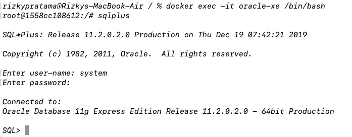 5. Membuat container untuk Oracle XE, port default oracle yaitu 1521, jadi pastikan port tersebut belum dipakai di laptop/komputer Mac kamu. Untuk membuat container Oracle XE, jalankan command berikut